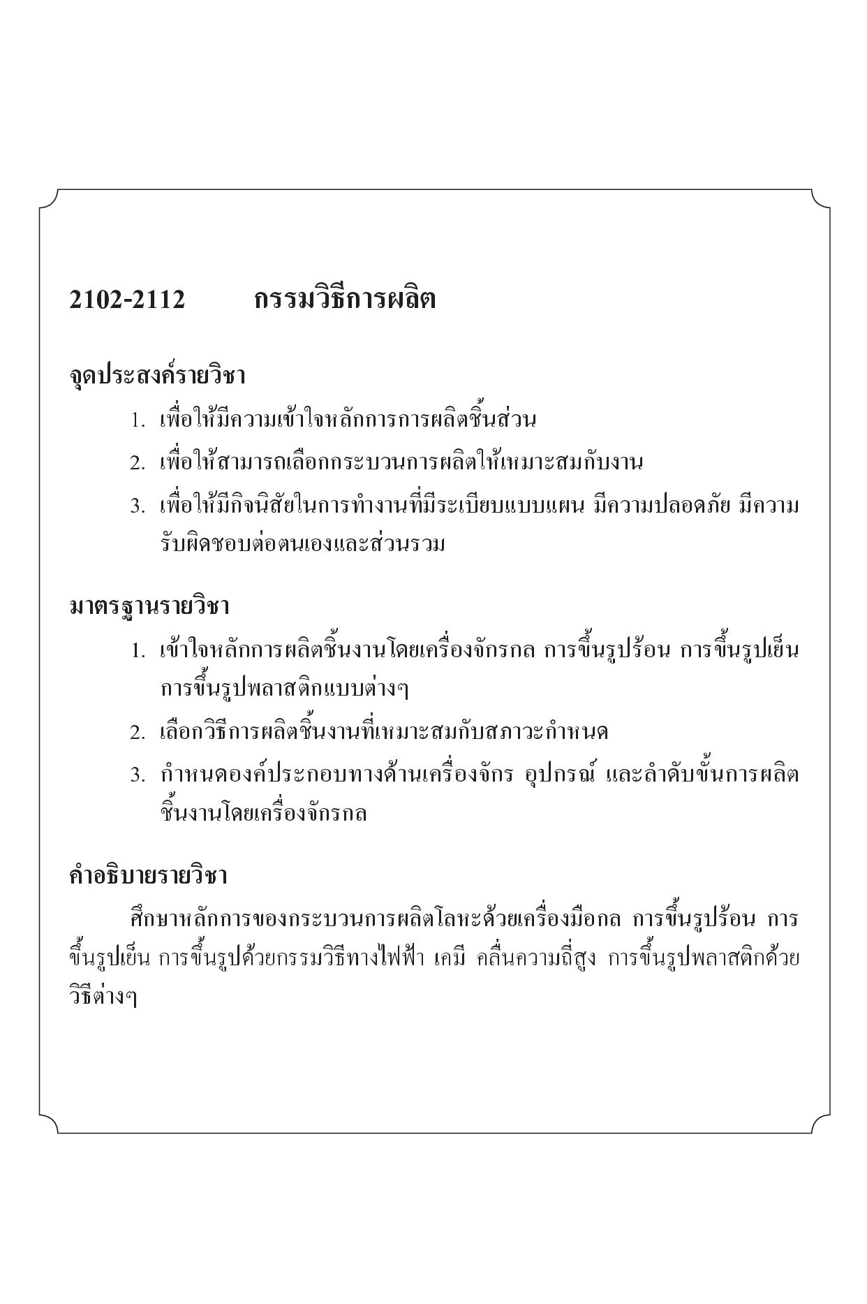 ให้เนื้อหาที่สำคัญเกี่ยวกับ "กรรมวิธีการผลิต" เป็นกรรมวิธีการผลิตชิ้นส่วนเครื่องกลและเครื่องมือด้วยเครื่องจักรสมัยใหม่ ควบคุมการผลิตด้วยคอมพิวเตอร์ ไม่ว่าจะเป็นกรรมวิธีการผลิตการหล่อแบบต่างๆ กรรมวิธีการผลิตแบบเปลี่ยนรูปแบบต่างๆ กรรมวิธีการผลิตการต่อหรือยึดชิ้นงานเข้าด้วยกันแบบต่างๆ กรรมวิธีการผลิตตกแต่งผิวชิ้นงานให้เรียบแบบต่างๆ และกรรมวิธีการเปลี่ยนแปลงสมบัติทางกายภาพ เหมาะสำหรับนักศึกษาระดับชั้น ปวช. และ ปวส. สาขาวิชาเทคนิคการผลิต สาขาวิชาเทคนิคอุตสาหกรรม สาขาวิชาเทคนิคการหล่อ สาขาวิชาแมคคาทรอนิกส์ และผู้ที่สนใจในกรรมวิธีการผลิตชิ้นส่วนเครื่องกลที่ต้องการอ่านเป็นความรู้ โดยมีเนื้อหาที่ตรงและครบถ้วนตามหลักสูตรของสำนักงานคณะกรรมการการอาชีวศึกษา