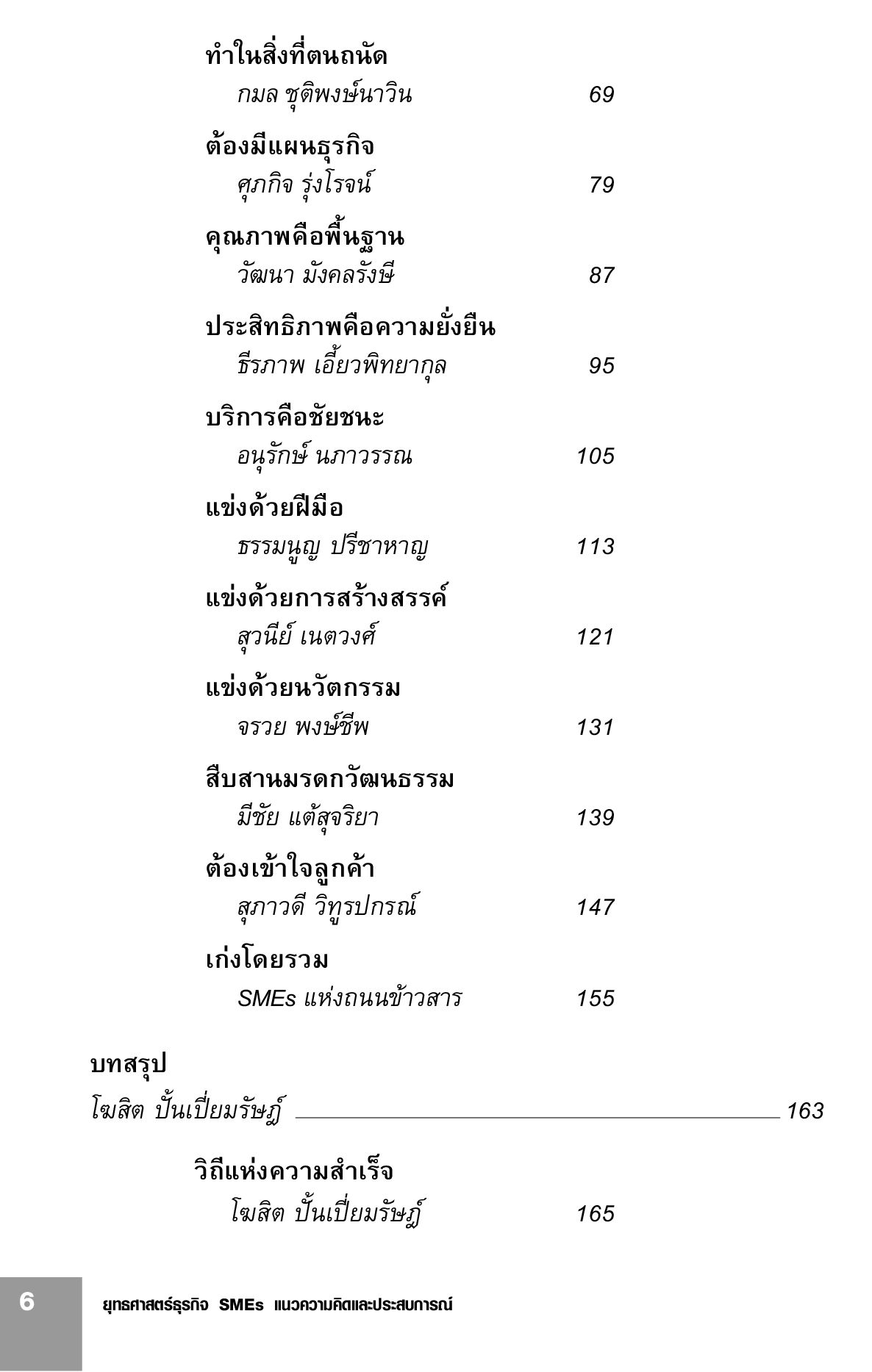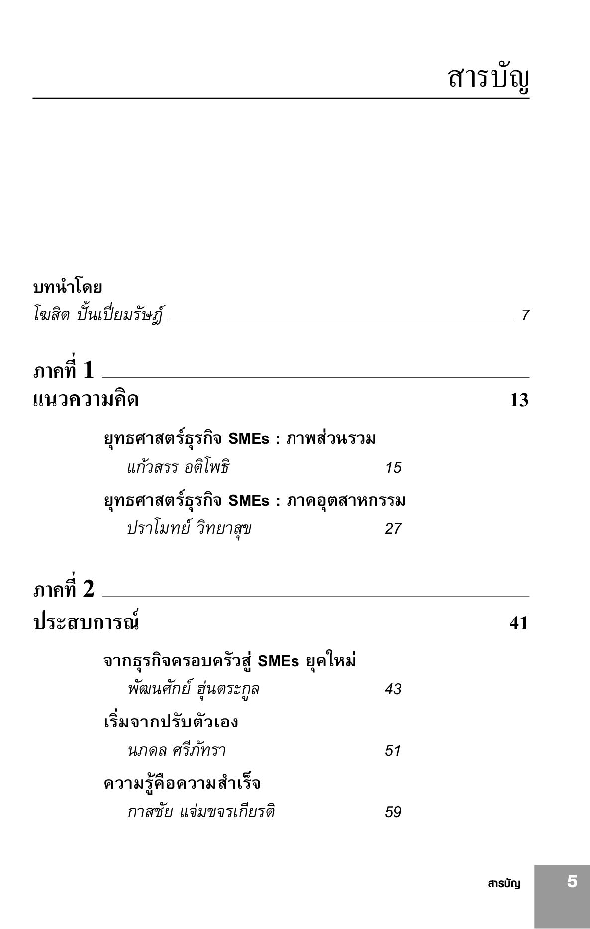 แยกสาระสำคัญเป็น 2 ส่วนคือส่วนแนวความคิด ซึ่งได้แบ่งเป็นยุทธศาสตร์ธุรกิจ SMEs ภาพส่วนรวม โดย แก้วสรร อติโพธิและภาคอุตสาหกรรม โดยปราโมทย์ วิทยาสุขรวมทั้งส่วนประสบการณ์จากผู้ประกอบการทั้ง 14 ท่านพร้อมทั้งได้จัดทำบทสรุปสาระสำคัญโดยโฆษิต ปั้นเปี่ยมรัษฎ์ ประธานกรรมการบริหาร ธนาคารกรุงเทพ จำกัด (มหาชน) ซึ่งจะเป็นข้อคิดและกำลังใจให้ผู้ประกอบการในการก้าวไปสู่ความสำเร็จอย่างยั่งยืน อันจะเป็นการเสริมสร้างรากฐานความเข้มแข็งให้แก่เศรษฐกิจของประเทศเป็นส่วนรวมในที่สุด