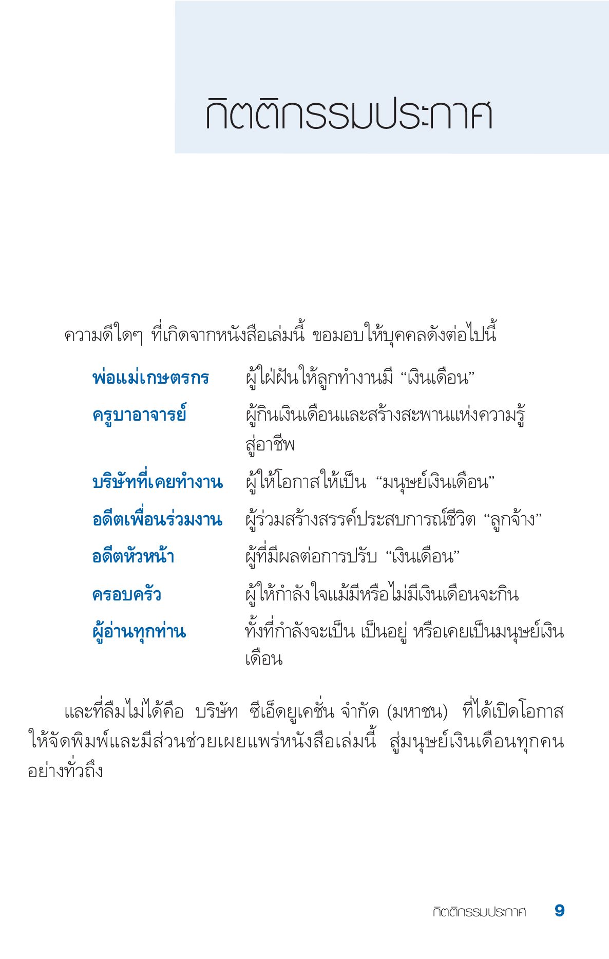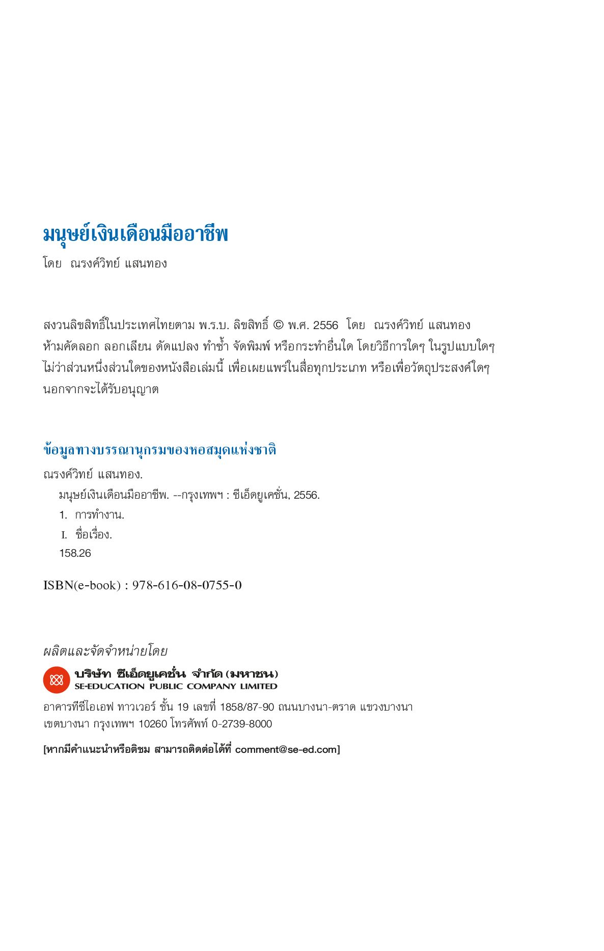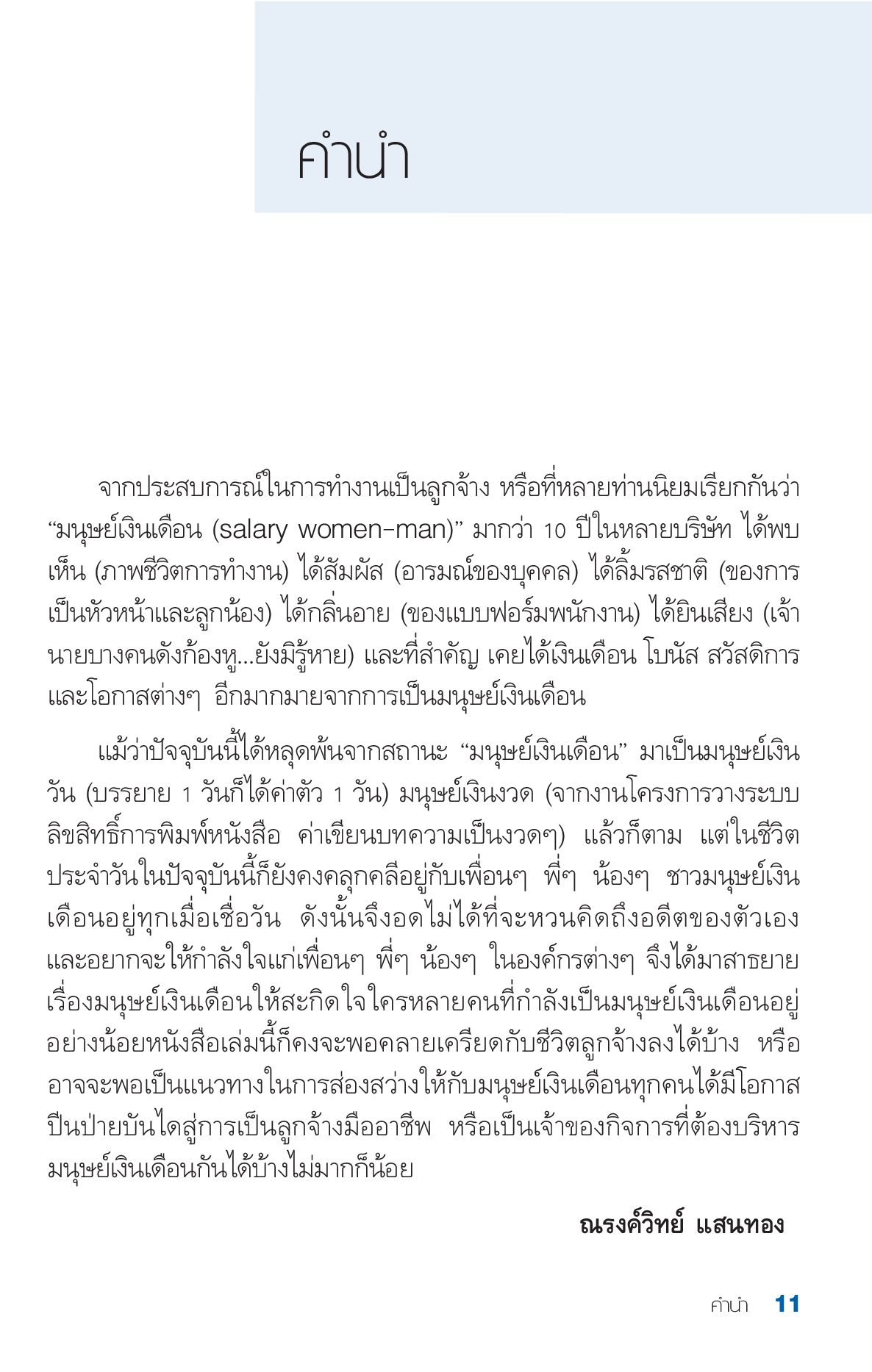คู่มือเล็กๆ สำหรับชีวิตคนทำงานตั้งแต่จบการศึกษามาจนถึงการสมัครงาน การสอบสัมภาษณ์ การทำงาน การเปลี่ยนงาน จนกระทั่งการเตรียมตัวและวางแผนก่อนออกจากอาชีพมนุษย์เงินเดือนสู่การทำอาชีพอิสระหรือธุรกิจส่วนตัว หรือก่อนการเกษียณอายุ โดยในเนื้อหาประกอบด้วย ทำไมมนุษย์เงินเดือนจึงควรอ่าน “มนุษย์เงินเดือน” อาชีพนี้ดีอย่างไร วางแผนเข้าสู่อาชีพมนุษย์เงินเดือน หางานอย่างไรให้สมหวัง เขียนประวัติอย่างไรจึงจะถูกใจผู้รับ มนุษย์เงินเดือนมือใหม่ควรจะปรับตัวอย่างไร ปรับเปลี่ยนความคิดให้เป็นบวก ข้อคิดในชีวิตสำหรับคนที่คิดจะเปลี่ยนงาน เตรียมตัวก่อนปรับค่าจ้างประจำปี เทคนิคการพัฒนาลูกน้องให้เป็นหัวหน้า เทคนิคการใช้หัวหน้าเป็นเครื่องมือสร้างความก้าวหน้า อย่าเสียเวลาทะเลาะกับเพื่อร่วมทาง ลด ละ เลิก ค่านิยม “ใช้ก่อนผ่อนทีหลัง” เทคนิคการทำงานอย่างมีความสุข การวางแผนออกจากอาชีพมนุษย์เงินเดือน เทคนิคการหาอาชีพอิสระหรือธุรกิจส่วนตัว เตรียมตัวปลดภาระทางการเงิน ฯลฯ หนังสือเล่มนี้จะช่วยสะกิด เตือนใจ และเสนอแนวทางใหม่ๆ ให้กับผู้อ่านได้นำไปใช้ในการบริหารชีวิตการเป็น “มนุษย์เงินเดือน” ได้อย่างมีความสุขมากยิ่งขึ้น
