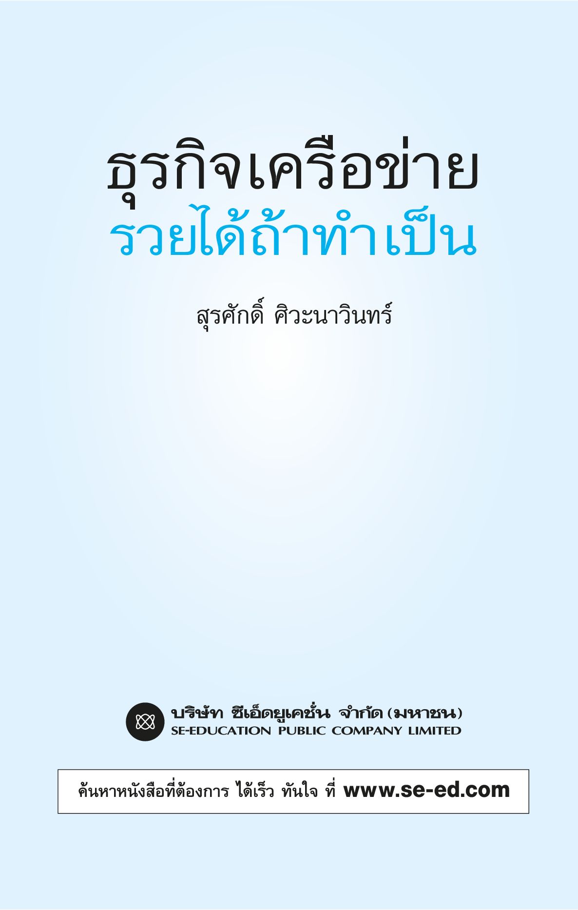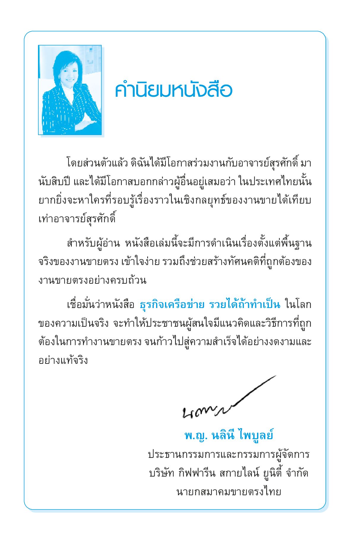 เผยแนวทางการสร้างความสำเร็จในธุรกิจเครือข่ายแบบไทยๆ บนโลกของความเป็นจริง พร้อมลูกล่อลูกชนในการพัฒนาสายงานที่มีนิสัยแบบไทยๆ ถ่ายทอดจากประสบการณ์ตรงของผู้เขียนและจากคำบอกเล่าของนักธุรกิจขายตรง รวมถึงการตอบคำถามและให้คำปรึกษากับคนที่ทำงานในภาคสนาม