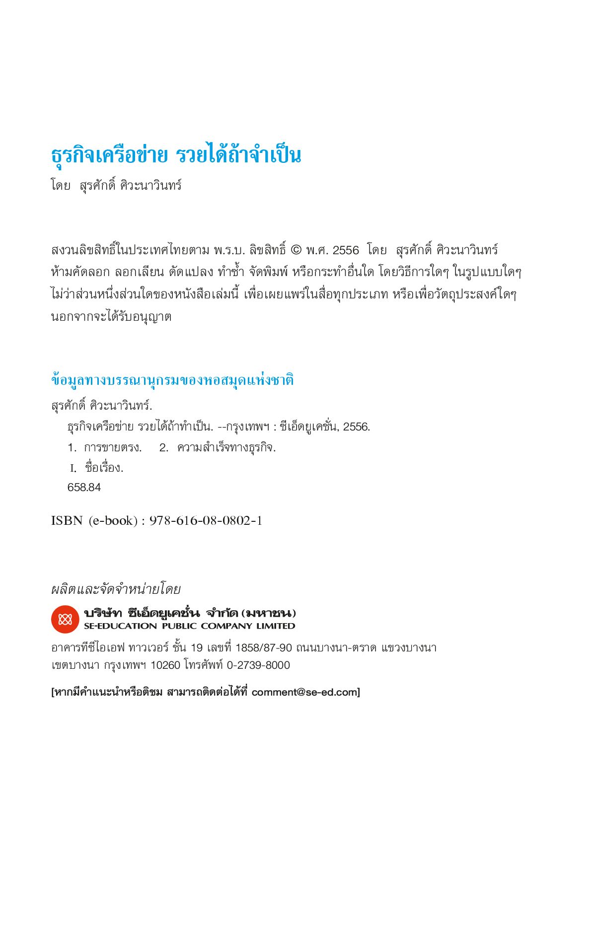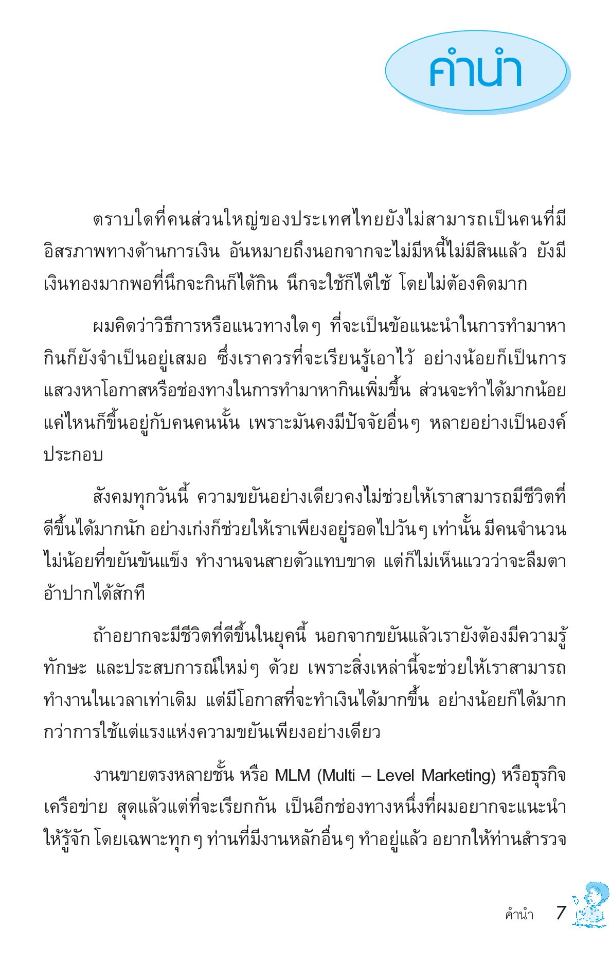 เนื้อหาในเล่มจะทำให้คุณทราบถึงเรื่องราวที่จำเป็นต้องรู้ในการทำธุรกิจขายตรง โดยเฉพาะอย่างยิ่ง ทำธุรกิจกับคนไทยๆ โดยเริ่มจากคนที่ไม่เคยอยู่ในวงการมาก่อน จนถึงขึ้นจะเอาดีและยึดเป็นอาชีพหลัก เพื่อให้ผู้ที่สนใจในธุรกิจนี้รู้วิธีในการทำงานและ แนวทางในการที่จะทำให้ตัวเองประสบความสำเร็จ!