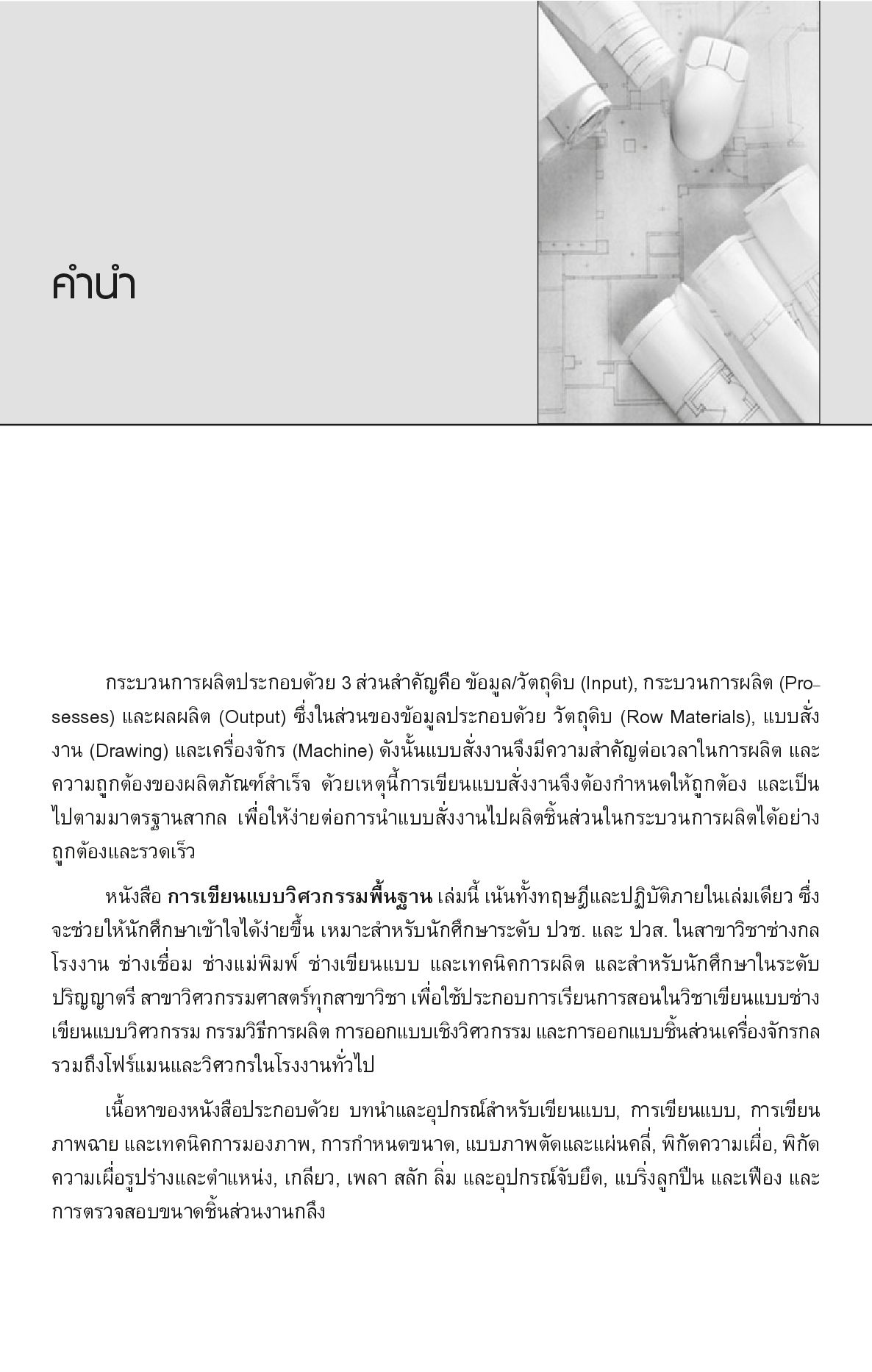 รวบรวมเทคนิคการเขียนแบบเบื้องต้น สำหรับนักศึกษาระดับ ปวช. ปวส. จนถึงปริญญาตรี ในหลักสูตรวิศวกรรมศาสตร์ และอื่นๆ ที่เกี่ยวข้อง ครอบคลุมตั้งแต่ประวัติความเป็นมา การเขียนด้วยมือ ตลอดจนการใช้เครื่องมือต่างๆ นับจากพื้นฐานการเขียนภาพ การมองภาพ การกำหนดขนาด พิกัดความเผื่อ พิกัดเผื่อรูปร่าง ความละเอียดผิวงาน ตลอดจนการเขียนชิ้นส่วนมาตรฐานต่างๆ และการเขียนแบบสั่งการผลิตเบื้องต้น โดยในเล่มได้อธิบายเนื้อหาอย่างเป็นลำดับขั้น เข้าใจง่าย พร้อมทั้งมีแบบฝึกหัดและแบบฝึกหัดทบทวนท้ายเล่ม ที่สามารถเรียนรู้ได้ง่ายๆ ด้วยตัวเอง