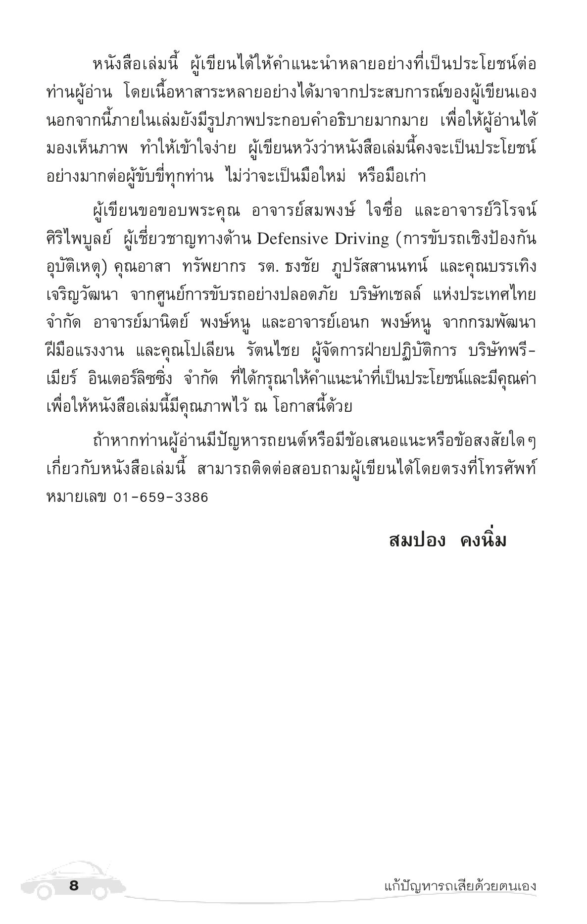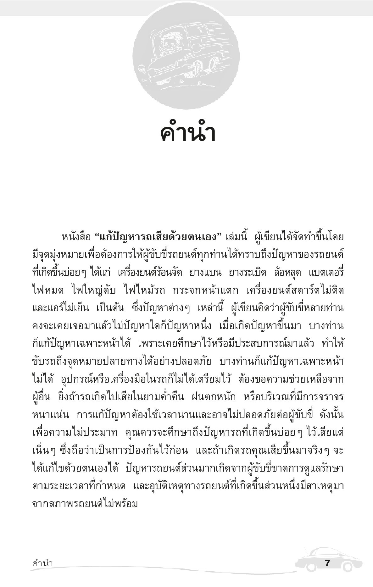 รวบรวมปัญหาเกี่ยวกับรถยนต์ที่เกิดขึ้นบ่อยๆ ในชีวิตประจำวัน ไม่ว่าจะเป็นเครื่องร้อนจัด ยางแบน ยางระเบิด ล้อหลุด แบตเตอรี่ไฟหมด ไฟใหญ่ดับหรือแอร์ไม่เย็น และอื่นๆ อีกมากมายที่คัดสรรมาอย่างดีแล้ว พร้อมแนะแนวทางในการแก้ปัญหาแบบง่ายๆ มีภาพรูปประกอบคำอธิบายมากมาย เพื่อให้ผู้อ่านได้มองเห็นภาพ ทำให้เข้าใจง่าย เหมาะอย่างยิ่งสำหรับผู้ขับขี่ทุกท่าน ไม่ว่าจะเป็นมือใหม่หรือมือเก่า