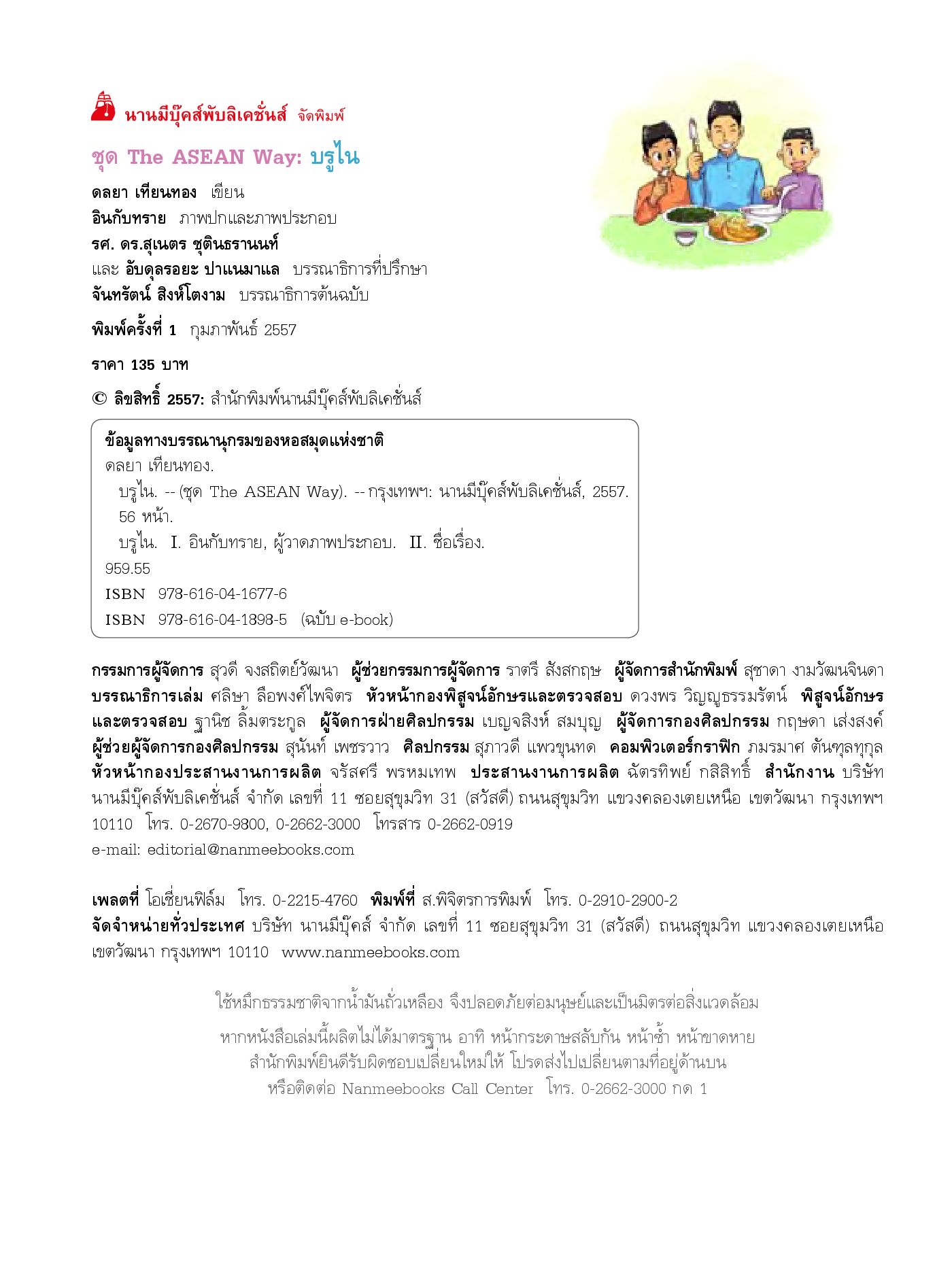 นานมีบุ๊คส์พับลิเคชั่นส์ร่วมกับสถาบันเอเชียศึกษา จุฬาลงกรณ์มหาวิทยาลัย พาทุกคนไปพบกับทุกเรื่องราวของประเทศบรูไน 1 ในสมาชิกอาเซียน ทั้งข้อมูลทั่วไป วิถีชีวิต วัฒนธรรม ประวัติศาสตร์ นิทานพื้นบ้าน คำศัพท์และบทสนทนาภาษามลายูและกิจกรรมแสนสนุกที่จะทำให้รู้จักและเข้าใจอาเซียน เพื่อก้าวเดินไปกับประชาคมอาเซียนได้อย่างรู้เท่าทัน