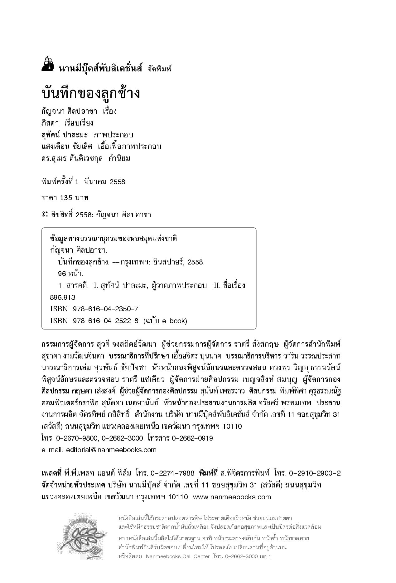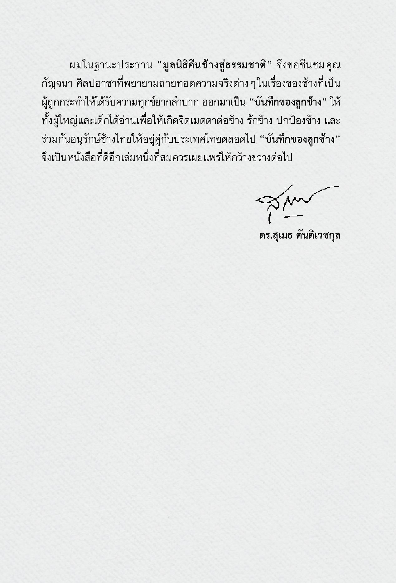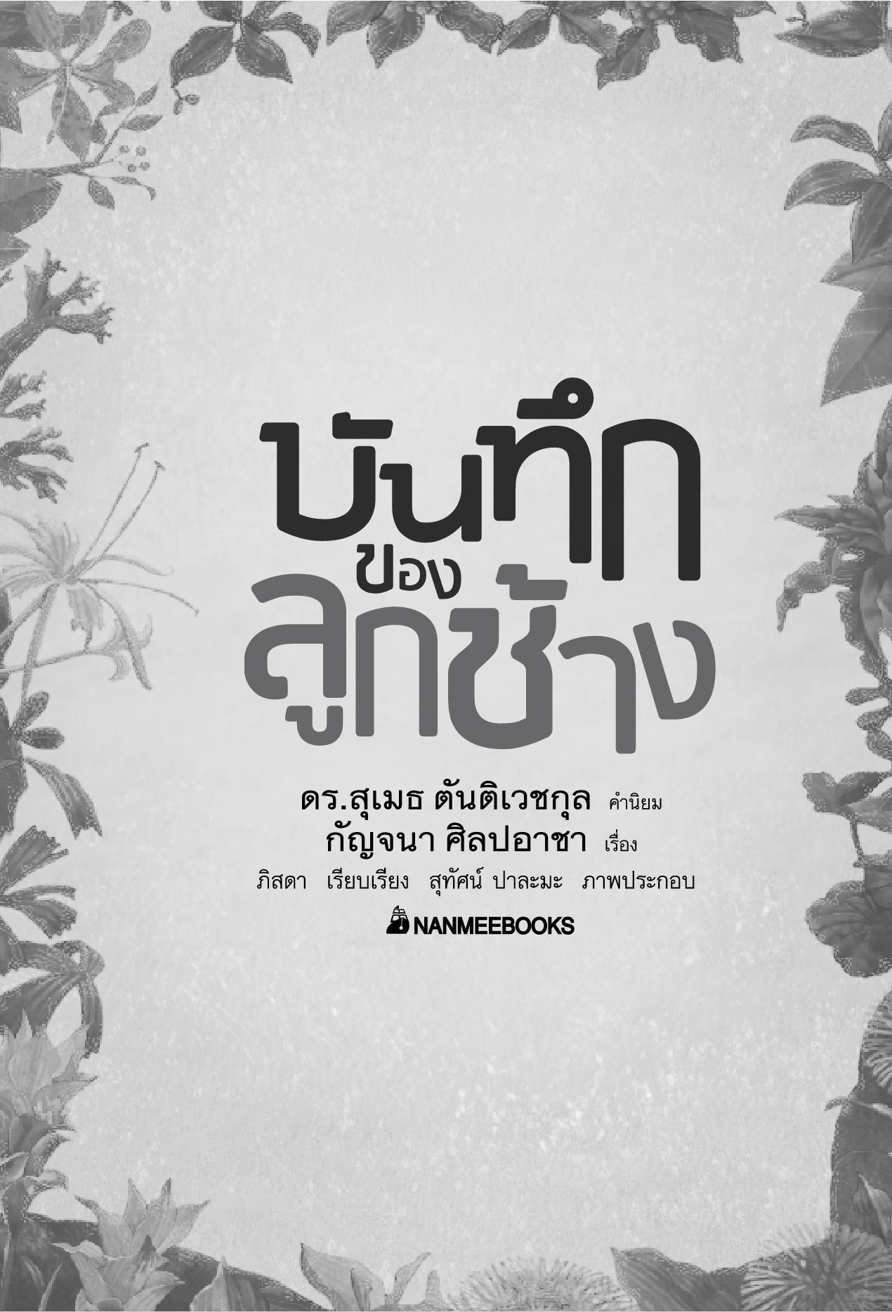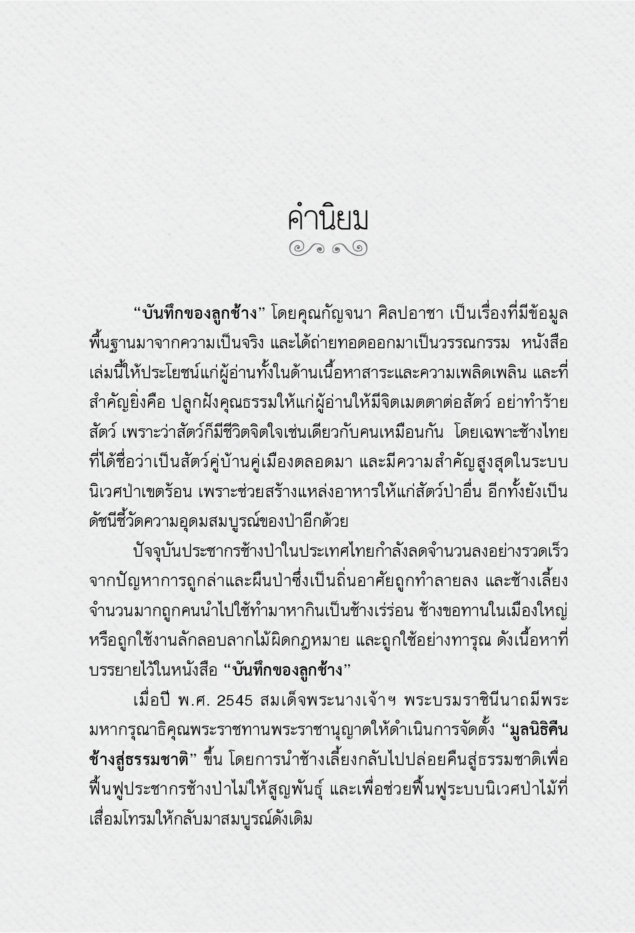 หนังสือ “บันทึกของลูกช้าง” มีเค้าโครงมาจากเรื่องจริง ช้างทุกเชือกที่ถูกเอ่ยถึงมีตัวตนจริง ๆ ตัวหนังสือที่ร้อยเรียงในรูปแบบวรรณกรรมนี้จะพาผู้อ่านเข้าไปสัมผัสโลกของช้างไทยในมุมที่หลายคนอาจไม่เคยรู้มาก่อน นอกจากจะได้รับความบันเทิงในความสดใสร่าเริงของ “ดอกไม้” ช้างเด็กวัยสองขวบซึ่งเป็นตัวละครเอกของเรื่องและผองเพื่อนแล้ว ผู้อ่านจะได้รู้ว่าชะตากรรมของช้างแต่ละเชือกถูกมนุษย์ทารุณอย่างไรบ้าง บางช่วงตอนจะทำให้สะเทือนใจจนน้ำตาไหล เช่น ช้างถูกผ่าจ้าน ช้างเดินเร่ร่อน ช้างถูกบังคับให้แสดงละครในสวนสัตว์