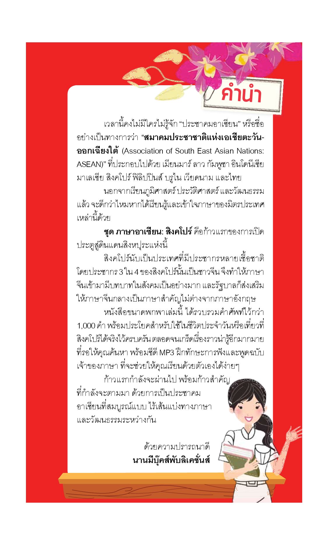 ก้าวสู่ประชาคมเศรษฐกิจอาเซียน (AEC) ปี 2558 ด้วยความมั่นใจไปกับหนังสือ ชุด ภาษาอาเซียน: สิงคโปร์ สอนภาษาจีนผ่านคำศัพท์กว่า 1,000 คำและประโยคที่ใช้ได้จริงในชีวิตประจำวันกว่า 500 ประโยค สามารถฝึกทักษะการพูดและการฟัง ได้ด้วยตัวเองพร้อมกับ CD-MP3 โดยแบ่งออกเป็น 9 บท ได้แก่