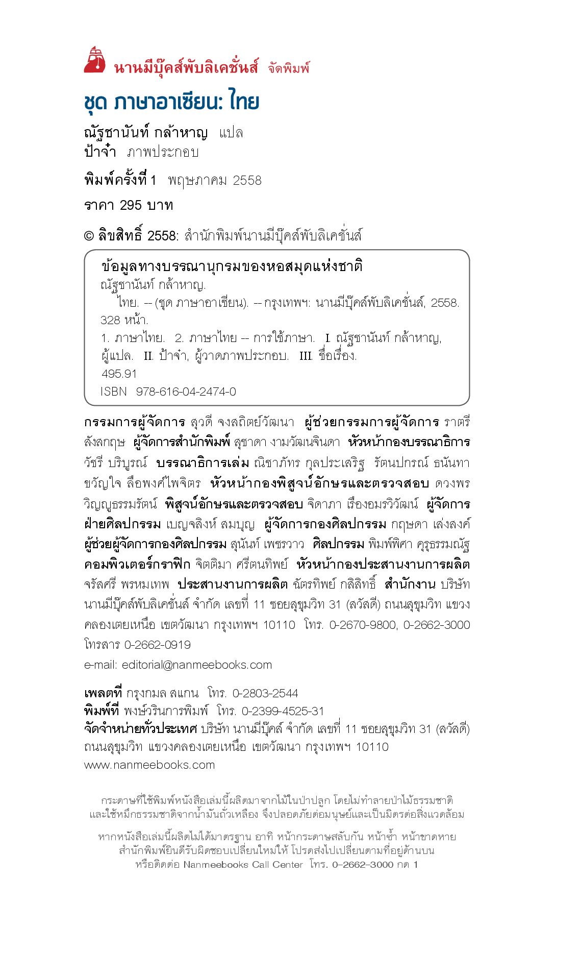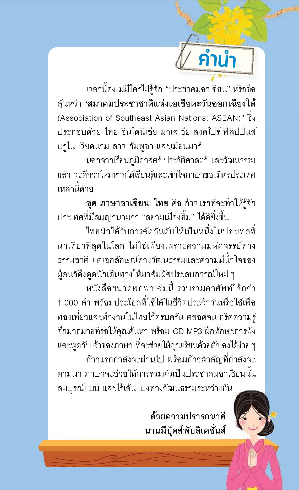 ก้าวสู่ประชาคมเศรษฐกิจอาเซียน (AEC) ปี 2558 ด้วยความมั่นใจไปกับหนังสือ ชุด ภาษาอาเซียน ซึ่งสอนภาษาไทยให้ชาวต่างชาติผ่านคำศัพท์และประโยคภาษาอังกฤษ โดยใช้หลักเกณฑ์การถอดอักษรไทยเป็นอักษรโรมันแบบถ่ายเสียง (ภาษาคาราโอเกะ) พร้อมฝึกทักษะการฟังและพูดด้วย CD-MP3