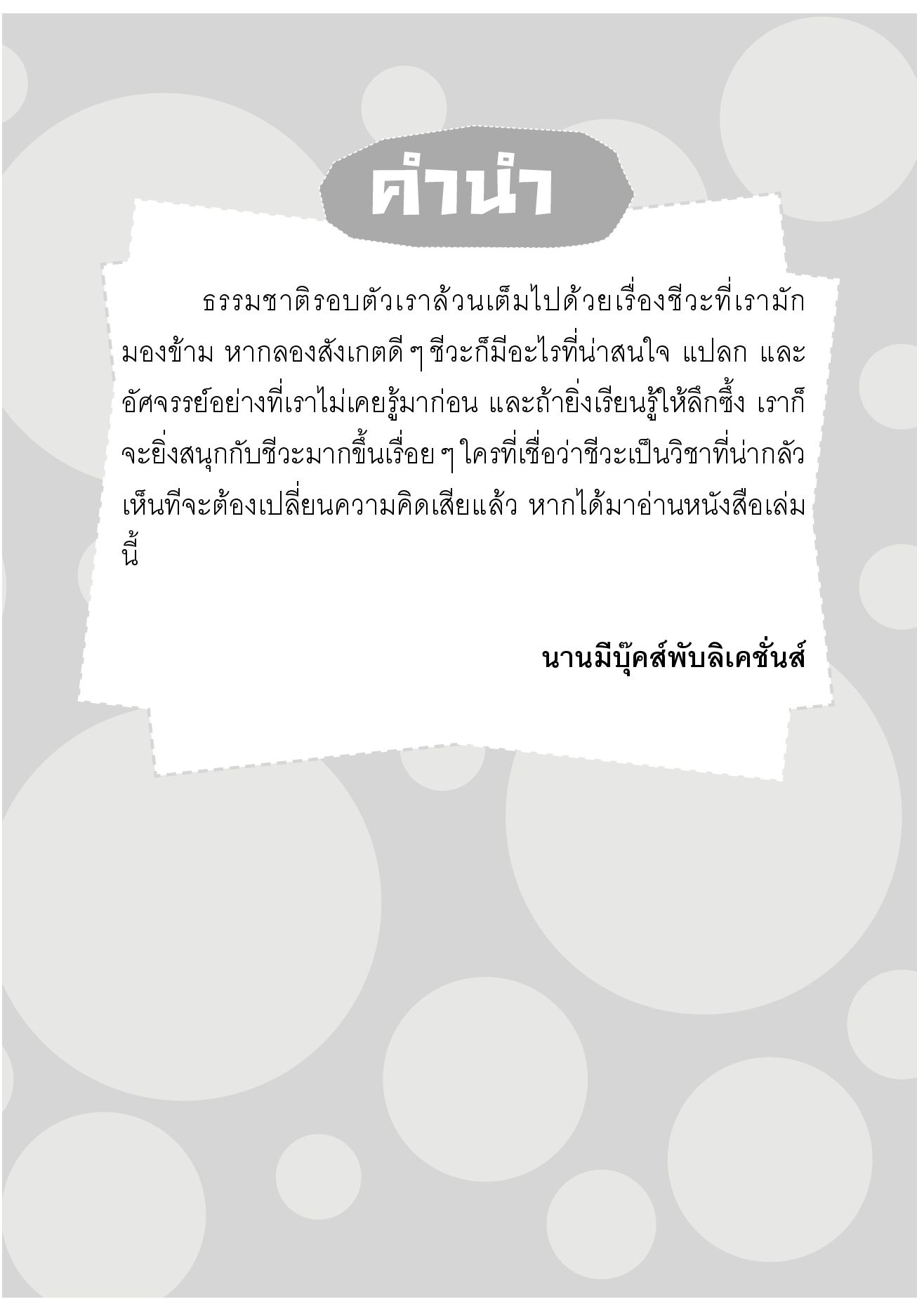 ธรรมชาติรอบตัวเราล้วนเต็มไปด้วยเรื่องชีวะที่เรามักมองข้าม หากลองสังเกตดีๆ ชีวะก็มีอะไรที่น่าสนใจ แปลก และอัศจรรย์อย่างที่เราไม่เคยรู้มาก่อน และถ้ายิ่งเรียนรู้ให้ลึกซึ้ง เราก็จะยิ่งสนุกกับชีวะมากขึ้นเรื่อยๆ ใครที่เชื่อว่าชีวะเป็นวิชาที่น่ากลัวเห็นทีจะต้องเปลี่ยนความคิดเสียแล้ว หากได้มาอ่านหนังสือเล่มนี้