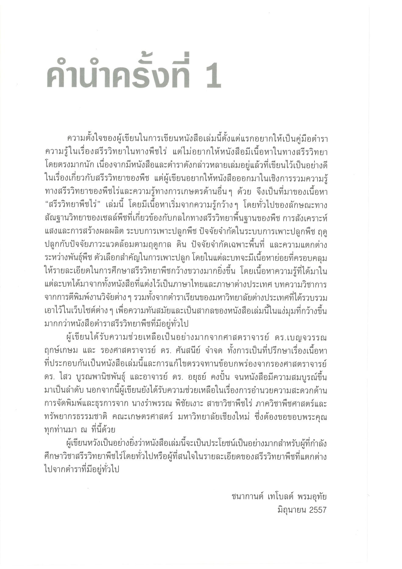 ความตั้งใจของผู้เขียนในการเขียนหนังสือเล่มนี้ตั้งแต่แรกอยากให้เป็นคู่มือตำรา ความรู้ในเรื่องสรีรวิทยาในทางพืชไร่ แต่ไม่อยากให้หนังสือมีเนื้อหาในทางสรีรวิทยา โดยตรงมากนัก เนื่องจากมีหนังสือและตำราดังกล่าวหลายเล่มอยู่แล้วที่เขียนไว้เป็นอย่าง ดีในเรื่องเกี่ยวกับสรีรวิทยาของพืช แต่ผู้เขียนอยากให้หนังสือออกมาในเชิงการรวมความ รู้ทางสรีรวิทยาของพืชไร่และความรู้ทางการเกษตรด้านอื่นๆ ด้วย จึงเป็นที่มาของเนื้อหา “สรีรวิทยาพืชไร่” เล่มนี้ โดยมีเนื้อหาเริ่มจากความรู้กว้างๆ โดยทั่วไปของลักษณะทาง สัณฐานวิทยาของเซลล์พืชที่เกี่ยวข้องกับกลไกทางสรีรวิทยาพื้นฐานของพืช การสังเคราะห์ แสงและการสร้างผลผลิต ระบบการเพาะปลูกพืช ปัจจัยจำกัดในระบบการเพาะปลูกพืช ฤดู ปลูกกับปัจจัยภาวะแวดล้อมตามฤดูกาล ดิน ปัจจัยจำกัดเฉพาะพื้นที่ และความแตกต่างระหว่างพันธุ์พืช ตัวเลือกสำคัญในการเพาะปลกู โดยในแต่ละบทจะมีเนื้อหาย่อยที่ครอบคลุมให้รายละเอียดในการศึกษาสรีรวิทยาพืชกว้างขวางมากยิ่งขึ้น โดยเนื้อหาความรู้ที่ได้มาในแต่ละบทได้มาจากทั้งหนังสือที่แต่งไว้เป็นภาษาไทยและภาษาตา่งประเทศ บทความวิชาการ จากการตีพิมพ์งานวิจัยต่างๆ รวมทั้งจากตำราเรียนของมหาวิทยาลัยต่างประเทศที่ได้รวบรวมเอาไว้ในเว็บไซต์ต่างๆ เพื่อความทันสมัยและเป็นสากลของหนังสือเล่มนี้ในแง่มุมที่กว้างขึ้นมากกว่าหนังสือตำราสรีรวิทยาพืชที่มีอยู่ทั่วไป