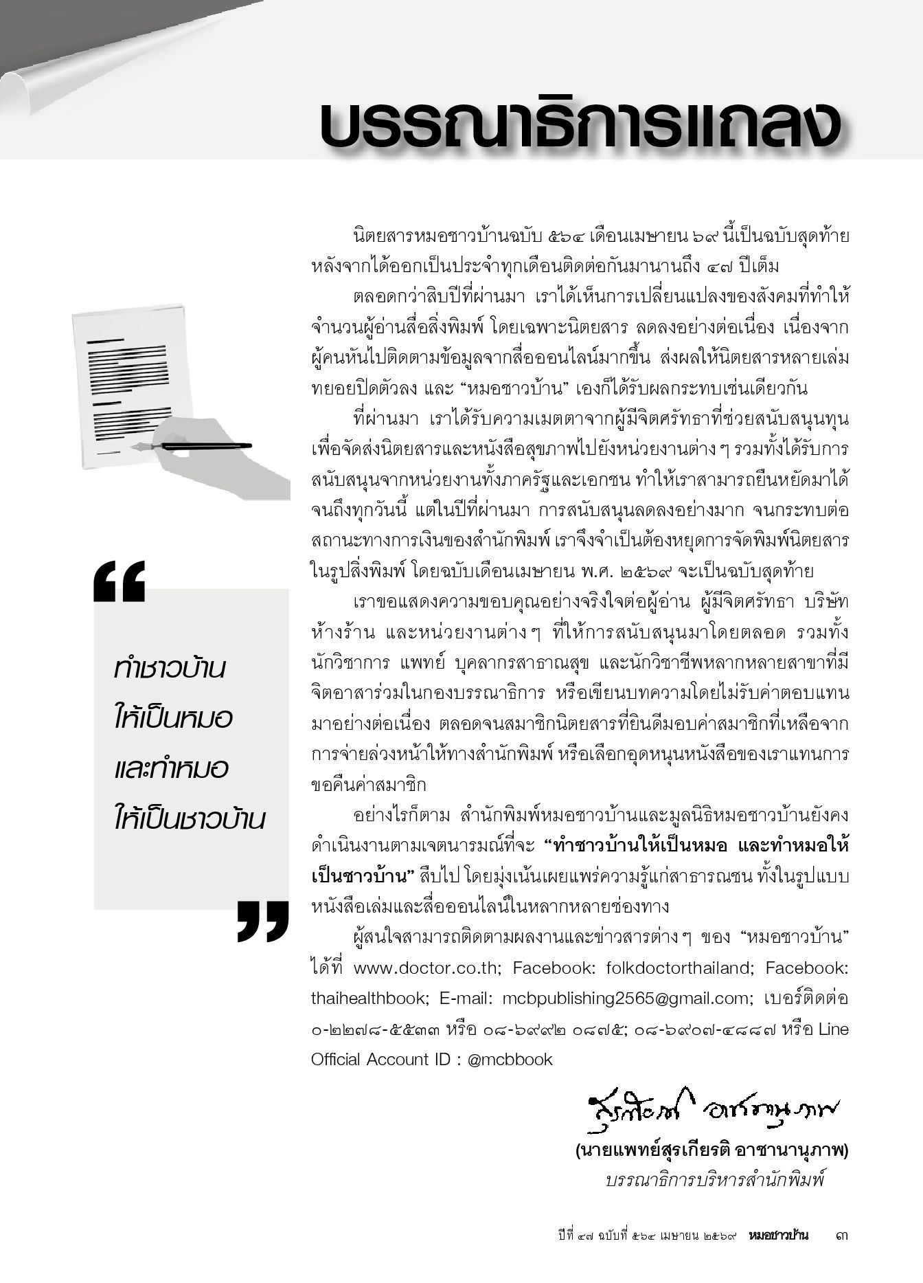 หมอชาวบ้าน เป็น e-magazine สุขภาพประจำทุกครอบครัว การดูแลสุขภาพด้วยตนเอง และสำหรับทุกเพศทุกวัยที่รักสุขภาพ