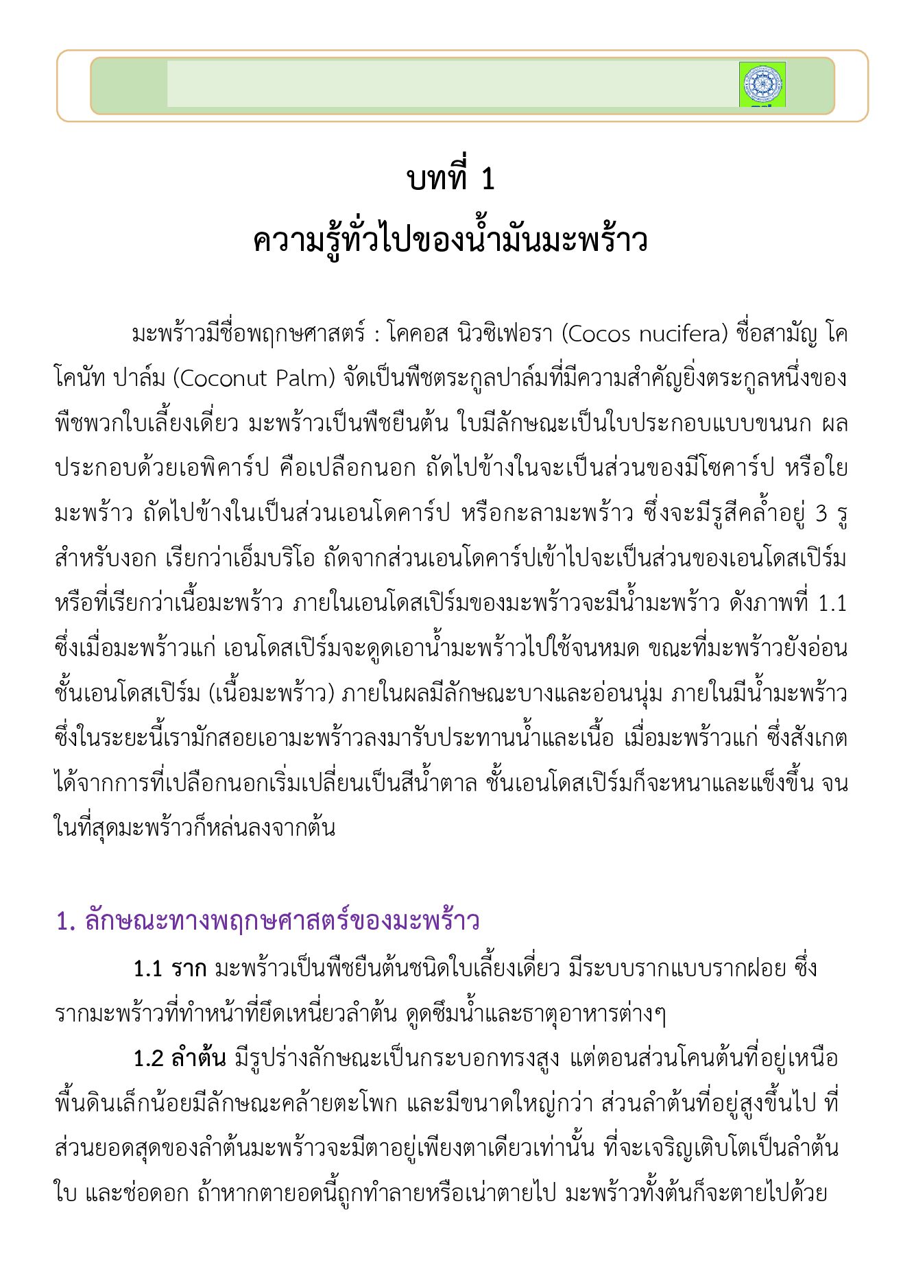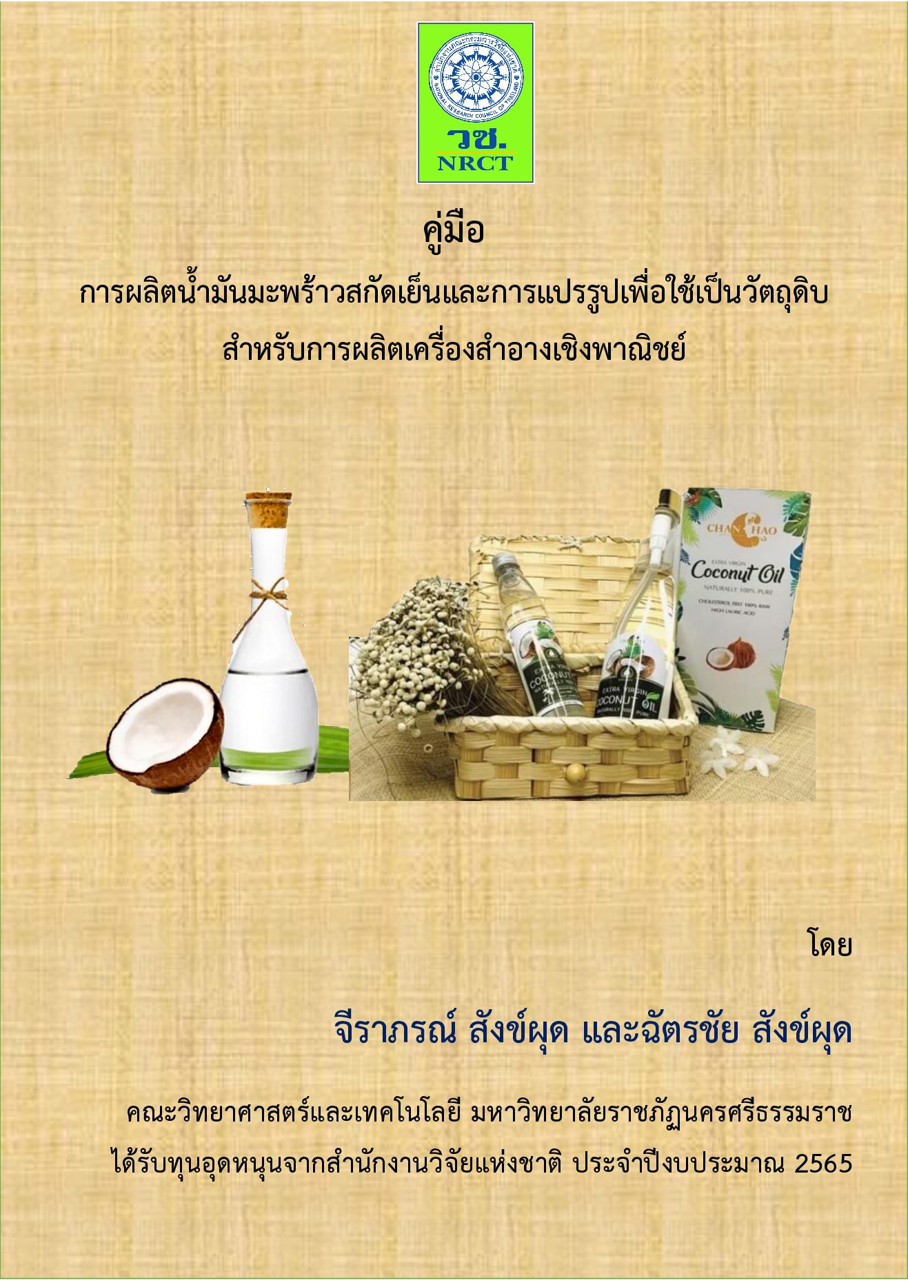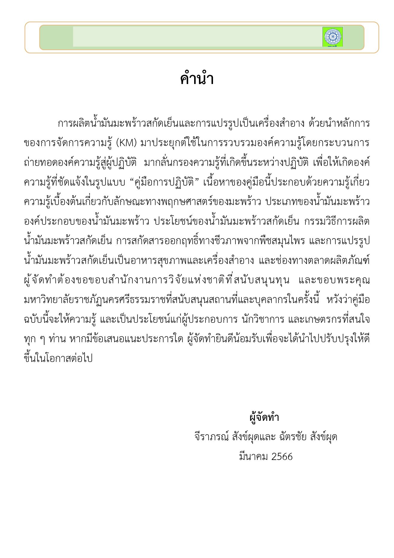การผลิตน้ํามันมะพร้าวสกัดเย็นและการแปรรูปเป็นเครื่องสําอาง ด้วยนําหลักการ ของการจัดการความรู้ (KM) มาประยุกต์ใช้ในการรวบรวมองค์ความรู้โดยกระบวนการ ถ่ายทอดองค์ความรู้สู่ผู้ปฏิบัติ มากลั่นกรองความรู้ที่เกิดขึ้นระหว่างปฏิบัติ เพื่อให้เกิดองค์ ความรู้ที่ชัดแจ้งในรูปแบบ “คู่มือการปฏิบัติ” เนื้อหาของคู่มือนี้ประกอบด้วยความรู้เกี่ยว ความรู้เบื้องต้นเกี่ยวกับลักษณะทางพฤกษศาสตร์ของมะพร้าว ประเภทของน้ํามันมะพร้าว องค์ประกอบของน้ํามันมะพร้าว ประโยชน์ของน้ํามันมะพร้าวสกัดเย็น กรรมวิธีการผลิต น้ํามันมะพร้าวสกัดเย็น การสกัดสารออกฤทธิ์ทางชีวภาพจากพืชสมุนไพร และการแปรรูป น้ํามันมะพร้าวสกัดเย็นเป็นอาหารสุขภาพและเครื่องสําอาง และช่องทางตลาดผลิตภัณฑ์ ผู้จัดทําต้องขอขอบสํานักงานการวิจัยแห่งชาติที่สนับสนุนทุน และขอบพระคุณ มหาวิทยาลัยราชภัฏนครศรีธรรมราชที่สนับสนุนสถานที่และบุคลากรในครั้งนี้ หวังว่าคู่มือ ฉบับนี้จะให้ความรู้ และเป็นประโยชน์แก่ผู้ประกอบการ นักวิชาการ และเกษตรกรที่สนใจ ทุก ๆ ท่าน หากมีข้อเสนอแนะประการใด ผู้จัดทํายินดีน้อมรับเพื่อจะได้นําไปปรับปรุงให้ดี ขึ้นในโอกาสต่อไป
