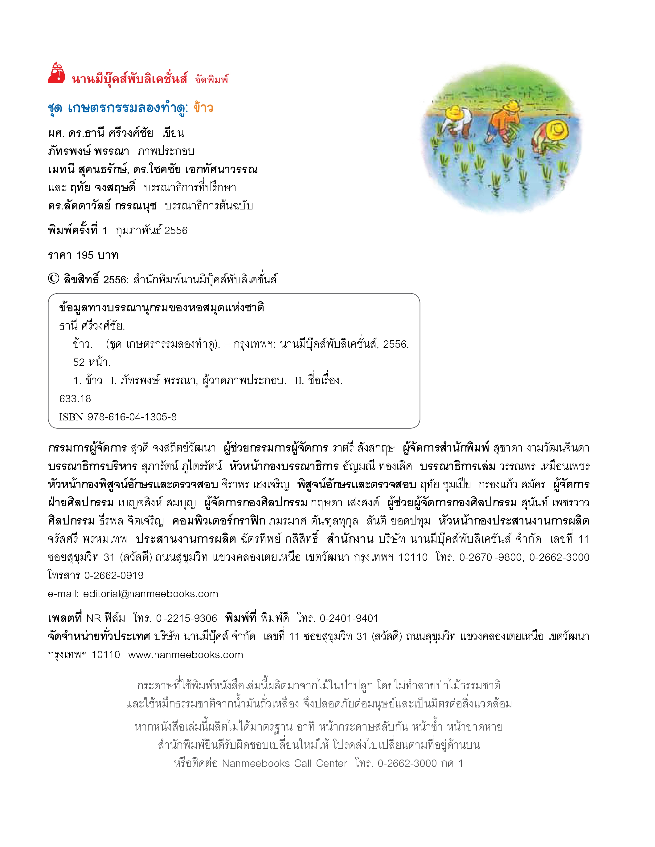 คู่มือการปลูกข้าวที่ครอบคลุมทุกเรื่อง ตั้งแต่รู้ตักรูปร่างหน้าของต้นข้าว ถิ่นกำเนิด พันธุ์ข้าวไทย ชนิดของข้าว และการทำนาแบบต่างๆ แนะนำวิธีปลูกข้าวตั้งแต่เริ่มเตรียมดิน คัดเลือกเมล็ดพันธุ์ การเพาะกล้า การดำนา โรคและศัตรูข้าว วิธีเกี่ยวข้าว สิ่งประดิษฐ์จากฟางข้าว และการทำอาหารจากข้าว เล่าเรื่องด้วยภาพการ์ตูนน่ารักสดใส เข้าใจง่าย